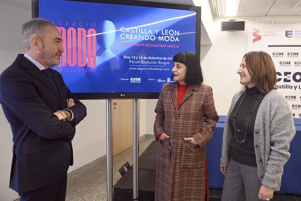 Ricardo Ordóñez / ICAL . La secretaria general de CEOE Castilla y León, Teresa Cetulio, y el secretario general de la Consejería de Industria, Comercio y Empleo de la Junta de Castilla y León, Alberto Díaz Pico, acompañados por la diseñadora, Fely Campo, presentan ‘Espacio Moda Castilla y León’
