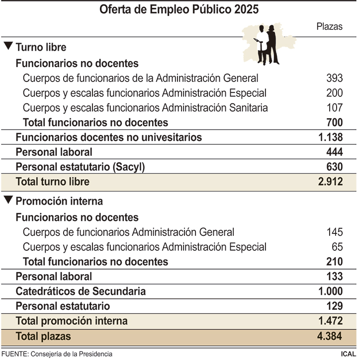 La Consejería de la Presidencia aprobó hoy, con la publicación de la orden en el Boletín Oficial de Castilla y León (Bocyl), la Oferta de Empleo Público (Opep) para el año 2025 que incluye 2.962 puestos del turno libre y 1.472 de promoción interna.