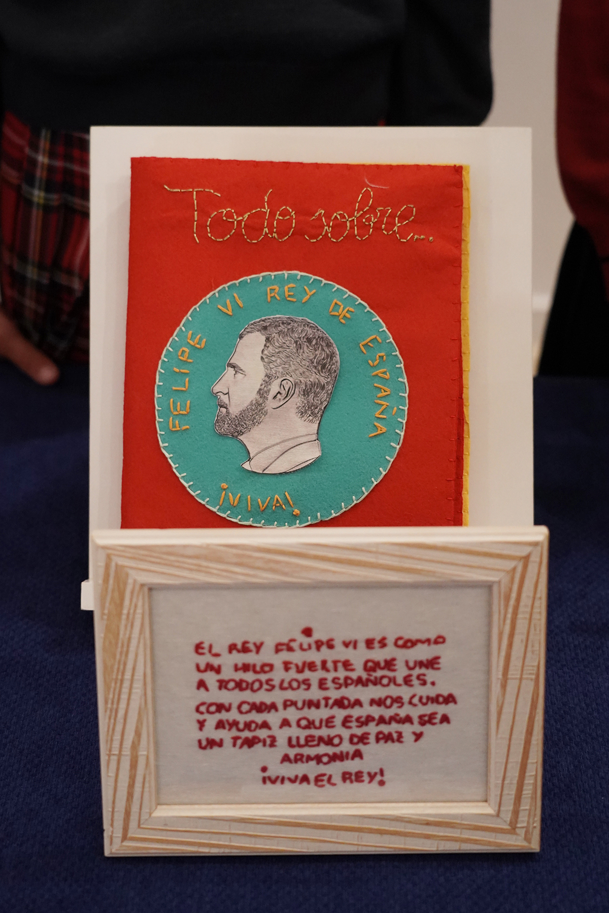 El jurado destacó el trabajo elaborado por la alumna que ha presentado un libro de fieltro con las hojas interiores bordadas que tratan temas como la genealogía de la Casa Real, la Corona y la bandera, el rey con el deporte, sus aficiones, los uniformes y el compromiso del monarca con los ciudadanos que se esfuerzan, necesitan o sufren.