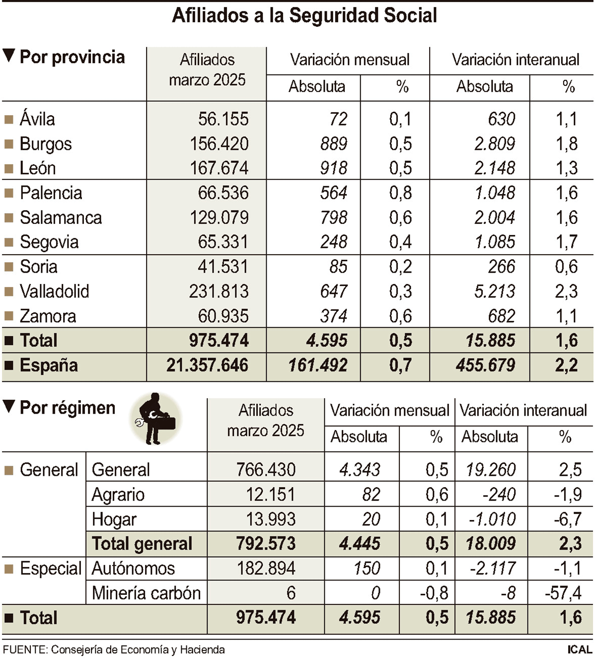 El número de afiliados a la Seguridad Social en Castilla y León se incrementó un 0,4 por ciento en el mes de marzo, al ganar 4.595 efectivos sobre el dato de febrero, lo que sitúa la cifra total en 975.474. El incremento autonómico es inferior al registrado en el conjunto de España, donde la subida fue del 0,7 por ciento, con 161.492 afiliados más, al cerrar el tercer mes del año con 21.357.646 afiliados.