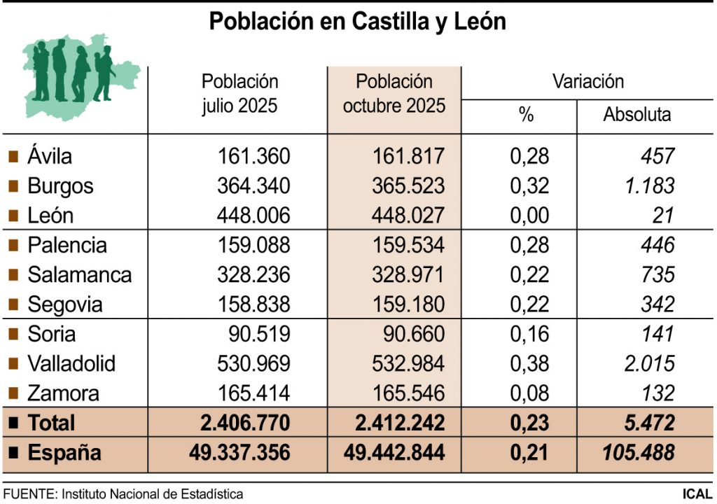 La población de Castilla y León creció durante el tercer trimestre del año un 0,23 por ciento, hasta alcanzar los 2.412.242 habitantes a 1 de octubre de 2025, lo que supone 5.472 personas más que tres meses antes. Este incremento fue superior al registrado en el conjunto del país, done el aumento fue del 0.21, hasta los 49,4 millones de habitantes, según los datos provisiones recogidos por Ical de la Estadística Continua de Población, publicada hoy por el Instituto Nacional de Estadística (INE).