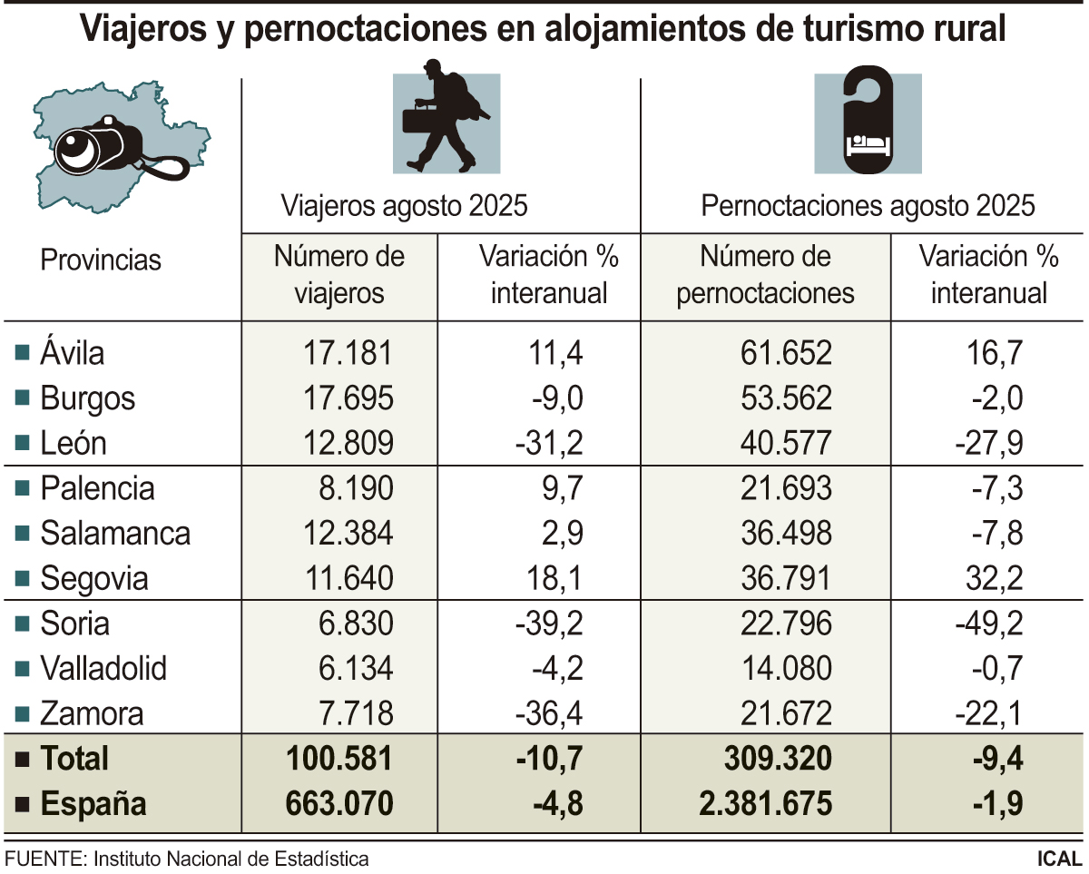 En pernoctaciones el comportamiento fue similar. Segovia lideró los incrementos con un 32,2 por ciento, hasta las 36.791, mientras que en Ávila fue la provincia que sumó más pernoctaciones en agosto hasta las 61.652 (+16,8 por ciento). En el resto de provincias se acumularon descensos, que en el caso de Soria fue del 49,3 por ciento (22.796), mientras que en León alcanzaron el 28 por ciento (40.577) y en Zamora el 22,2 por ciento (21.672). En Burgos se acumularon 53.562 pernoctaciones (-2 por ciento); en Palencia, 21.693 (-7,4 por ciento); en Salamanca, 36.498 (-7,8 por ciento) y en Valladolid, 14.080 (-0,8 por ciento).