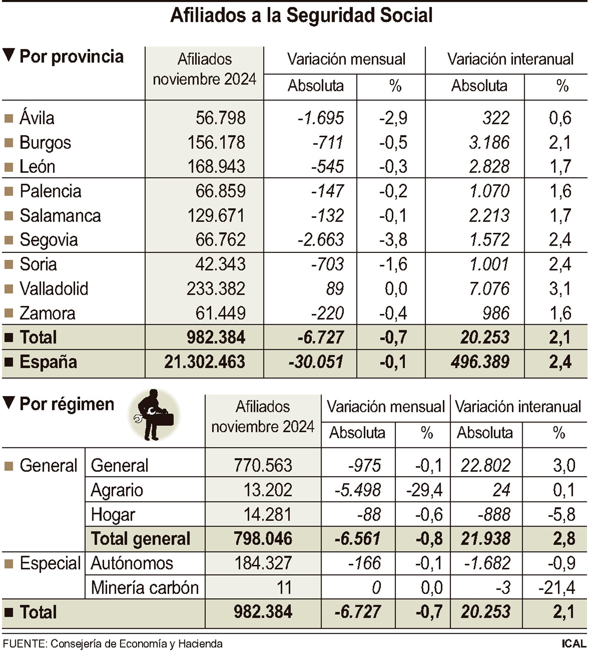 El número de afiliados a la Seguridad Social en Castilla y León bajó un 0,6 por ciento en el mes de noviembre, al perder 6.727 efectivos sobre el dato de octubre, lo que sitúa la cifra total en 982.384. El descenso autonómico está por encima de la bajada de la media del país, donde el dato cayó un 0,1 por ciento, con 30.051 afiliados menos, al cerrar el undécimo mes del año con 21.302.463 afiliados.