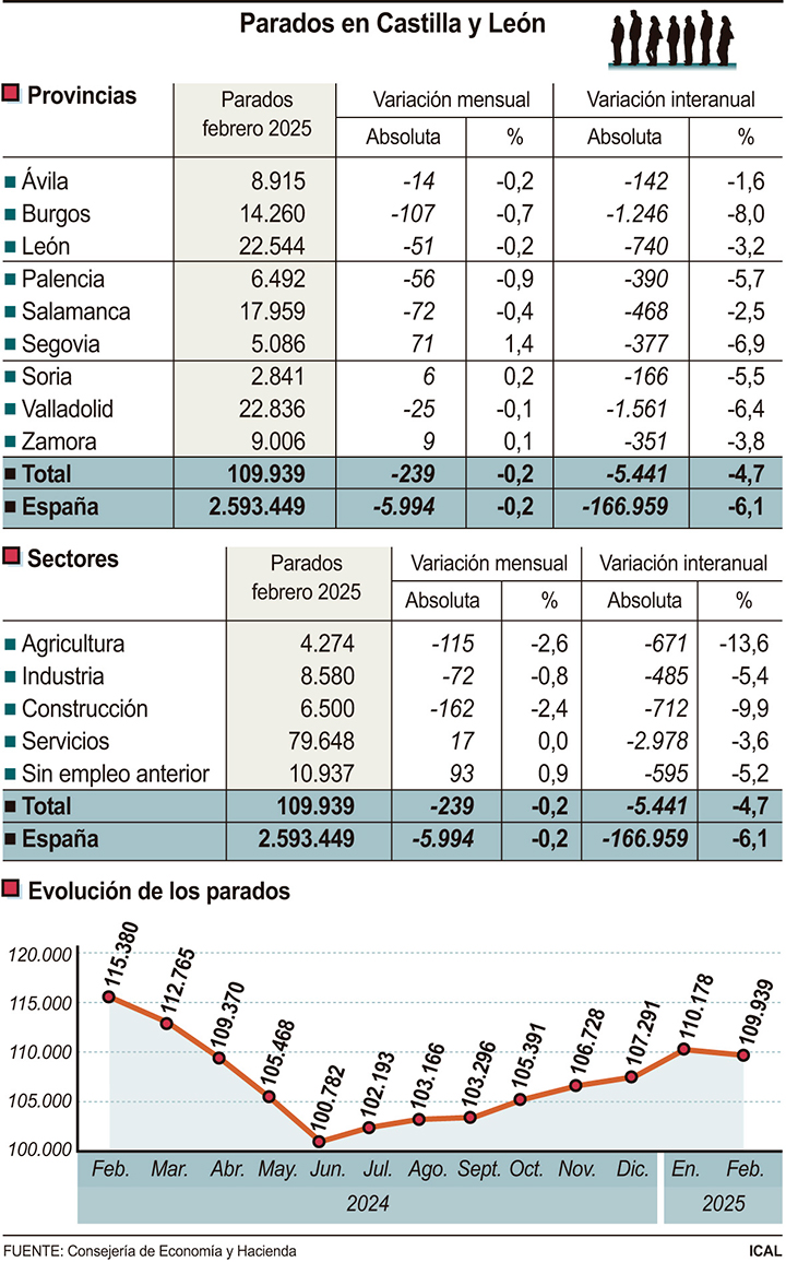 El desempleo en Castilla y León vivió una ligera caída durante el segundo mes de 2025 con una reducción del 0,22 por ciento, lo que supone contar con 239 parados menos y sitúa el número total de desempleados en 109.939. La cifra sigue la evolución nacional, donde el paro cayó un 0,23 por ciento al salir de las listas 5.944 personas, lo que sitúa a 2.593.449 ciudadanos en paro en febrero, la cifra más baja en 17 años en este mes.