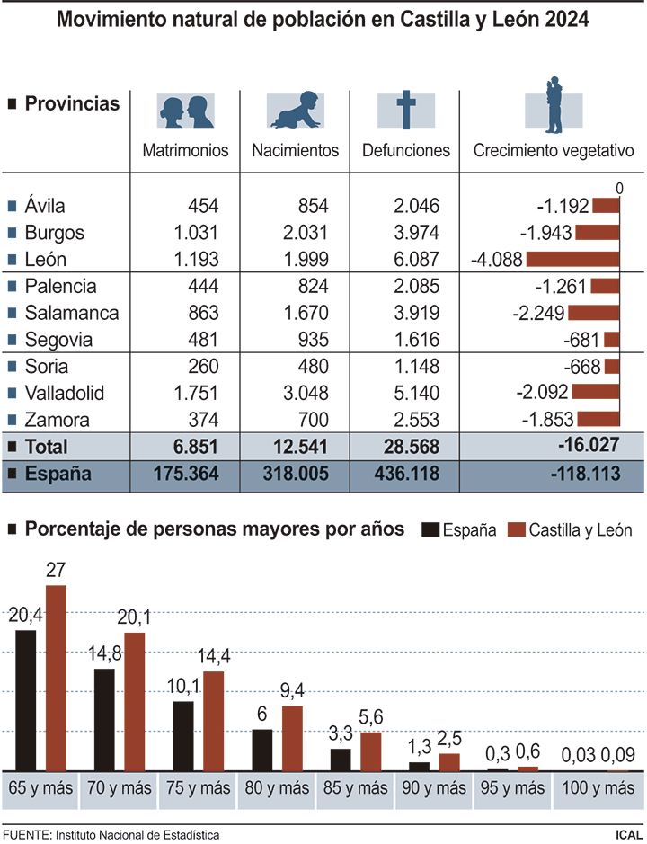 El número de defunciones está muy relacionado con la elevada edad de los castellanos y leoneses, en comparación con la del conjunto del país. No en vano, el 27 por ciento el total de la población de la Comunidad tenía 65 años o más en 2024, siete puntos más que la media nacional. Lo mismo ocurre entre los de 70 o mayores, 20 por ciento frente al 14,8 por ciento; los de 80 o más, 9,4 frente al seis por ciento; los de 90 o más, 2,5 frente al 1,3 por ciento.