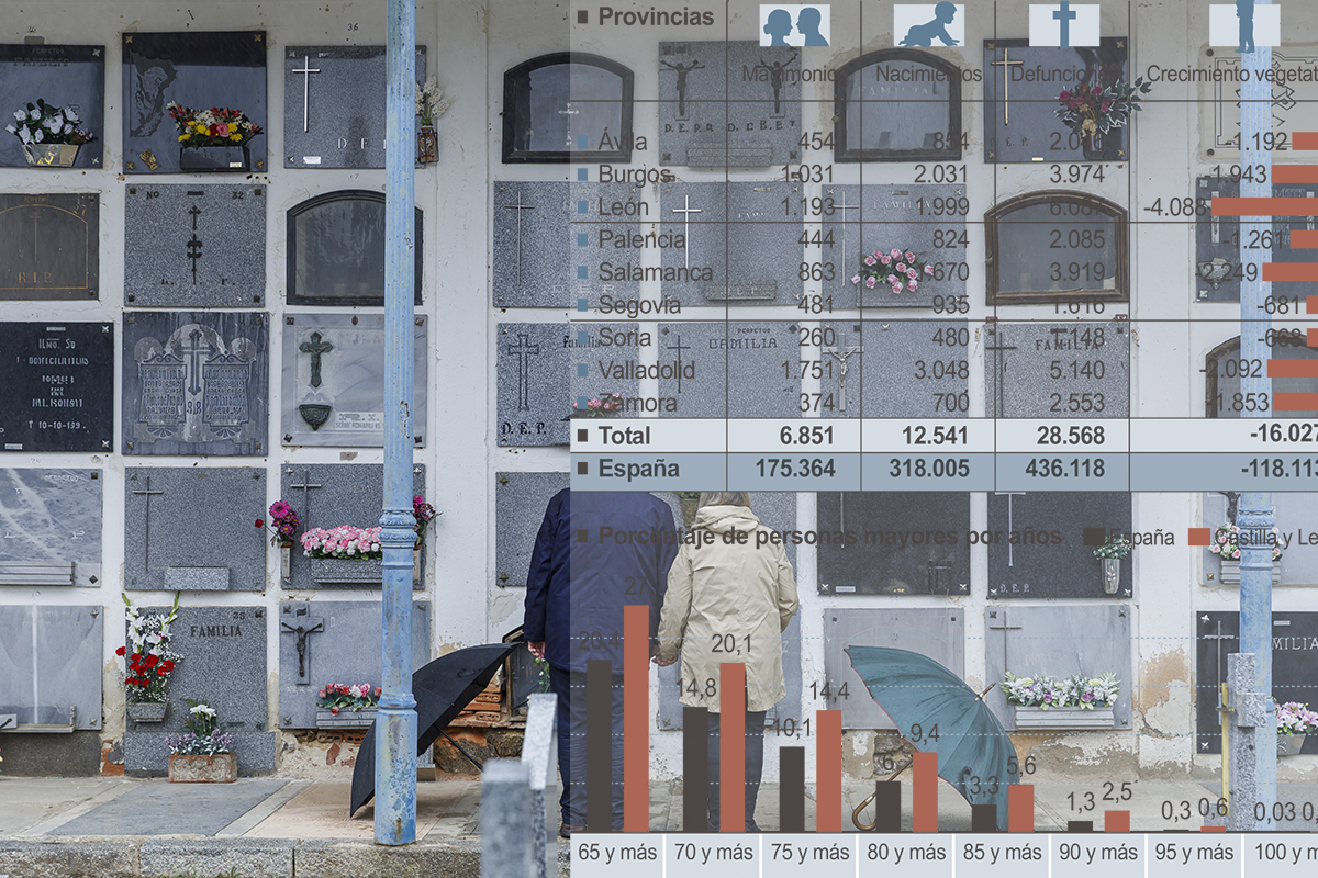 Los datos de mortalidad sitúan a Castilla y León como la tercera autonomía con mayor tasa bruta, con 11,92 defunciones cada mil habitantes, solo por debajo de los 12,95 de la autonomía asturiana, y los 12,08 de Galicia, lejos de los 8,87 de la media de España.