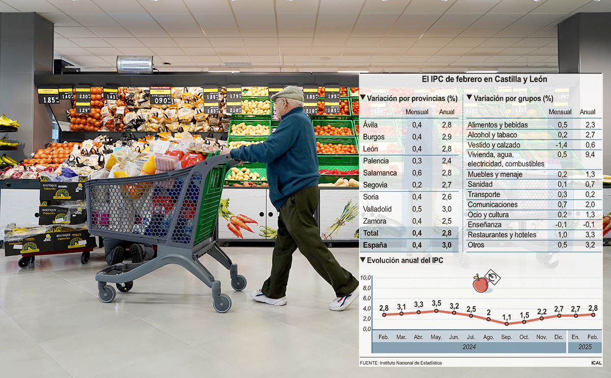 El Índice de Precios al Consumo (IPC) subió en febrero en Castilla y León un 2,8 por ciento con respecto a hace un año, lo que supone dos décimas menos que la media nacional (3 por ciento), según los datos publicados por el Instituto Nacional de Estadística (INE) y recogidos por Ical.