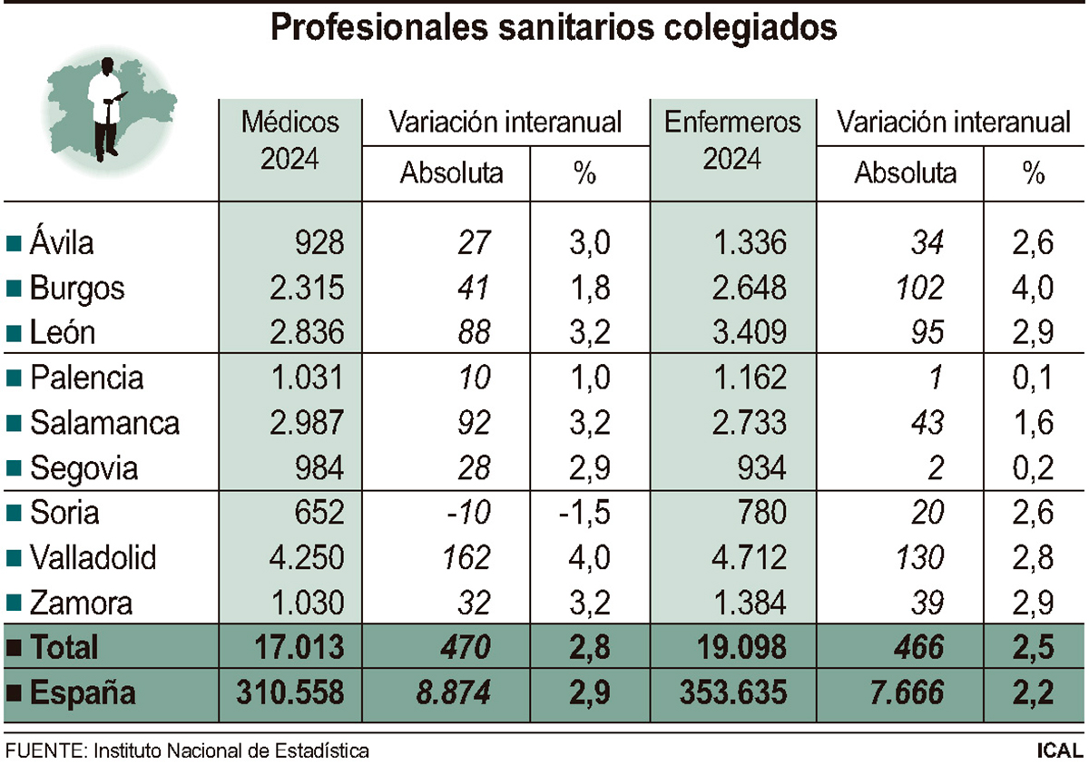 En cuanto al personal de enfermería, Castilla y León también añadió a 446 profesionales a sus colegios, lo que representa un aumento del 2,5 por ciento, lo que deja la cifra total de 19.098 colegiados. Esta evolución es superior a la que se produjo en todo el país, con 7.666 más, un 2,21 por ciento más, lo que deja el registro total en 353.635. Además, todas las provincias de la Comunidad anotaron aumentos el año pasado.