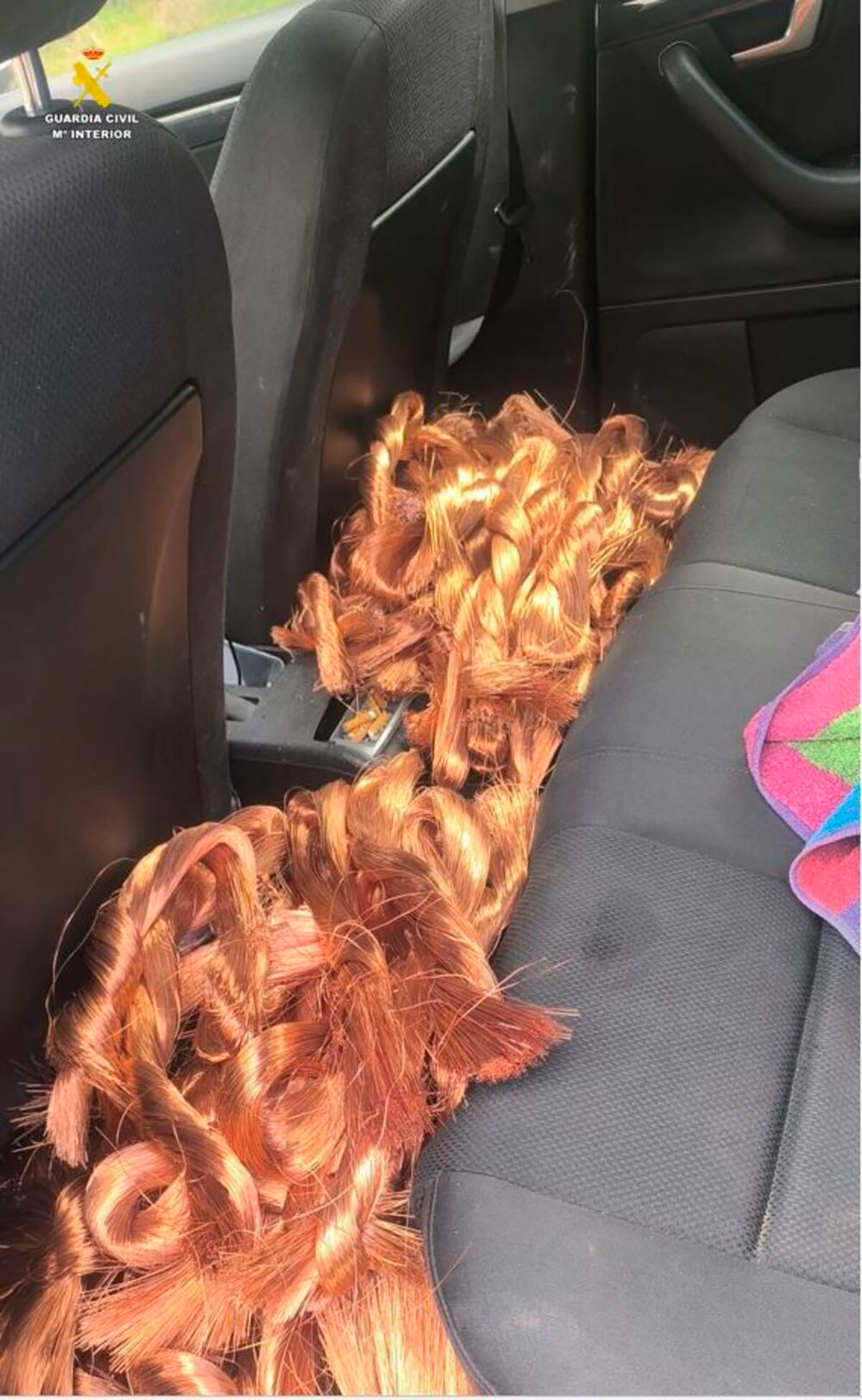 En el interior del turismo viajaban cuatro ocupantes. Durante el registro del vehículo, los agentes localizaron en la parte trasera un total aproximado de 200 kilos de cable de cobre, distribuidos en unas 180 piezas. El material se encontraba pelado, es decir, sin el recubrimiento plástico, y oculto bajo una toalla, lo que evidenciaba que estaba preparado para su venta.