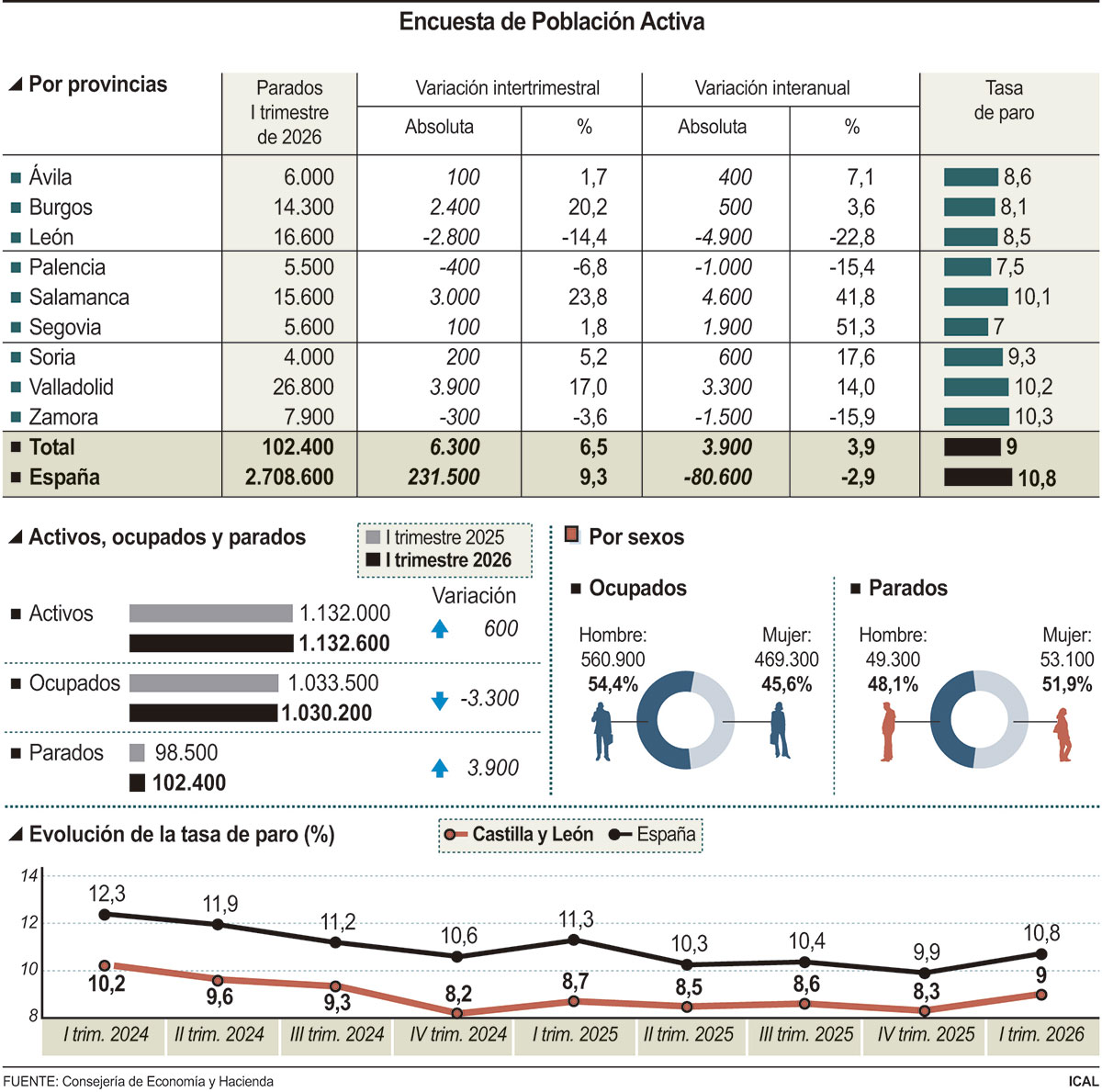 Finalmente, en relación a los ocupados, durante el primer trimestre de 2026, en valores absolutos, Valladolid se posicionó a la cabeza, con 234.800; seguida de León, con 179.200; Burgos, con 162.100; Salamanca, con 139.400; Segovia, con 74.200; Zamora, con 68.600; Palencia, 68.300; Ávila, 64.300; y Soria, 39.300.