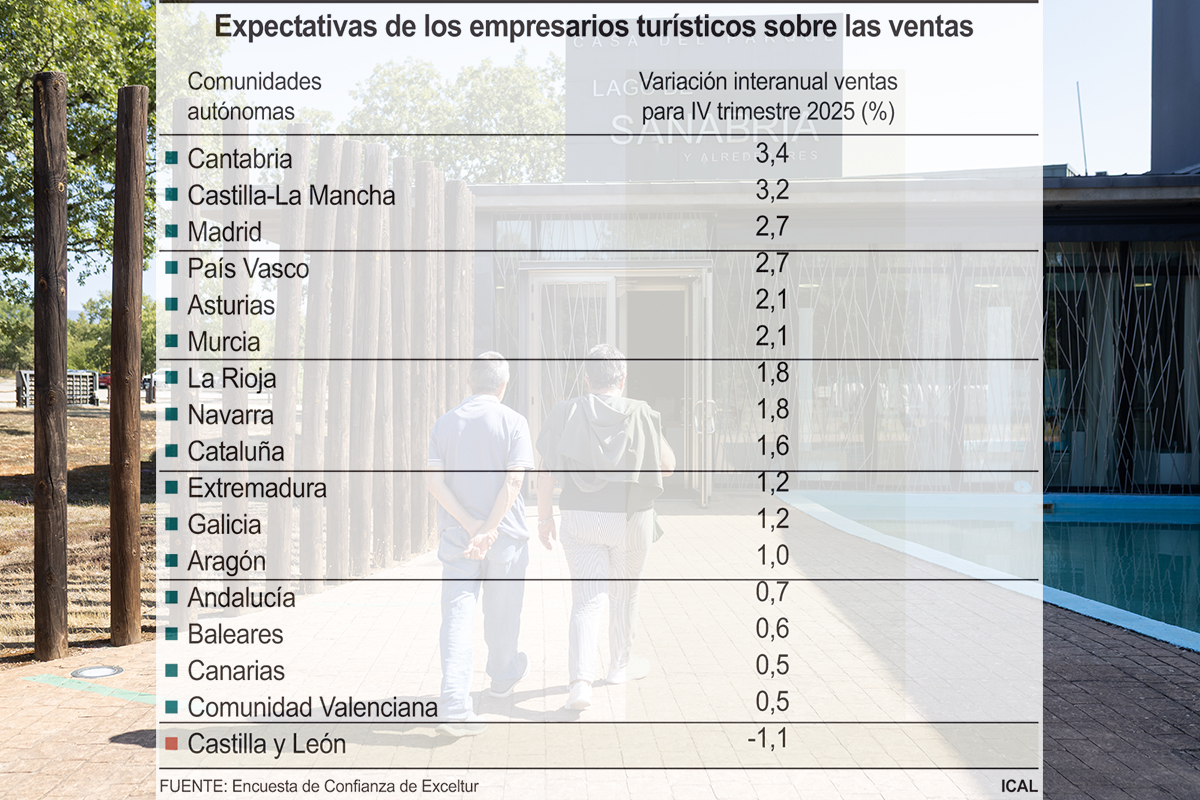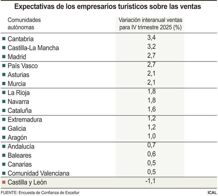 El cuarto trimestre de 2025 apunta a una desaceleración de los ritmos de crecimiento de las ventas en España de las empresas turísticas hasta el dos por ciento (por debajo del 2,8 por ciento del tercer trimestre). Unas expectativas empresariales que en el caso del destino de Castilla y León son negativas, con una caída interanual del 1,1 por ciento, que supone la única bajada en España. Unos datos que contrastan con el buen comportamiento registrado en verano, después de que la Comunidad lograra aumentar un once por ciento sus ingresos turísticos, con respecto al mismo periodo del año pasado, solo por detrás de La Rioja (13,1 por ciento). Unos ingresos que son muy superiores al incremento de pernoctaciones hoteleras entre junio y agosto registrados en Castilla y León, que solo subieron un 1,8 por ciento.