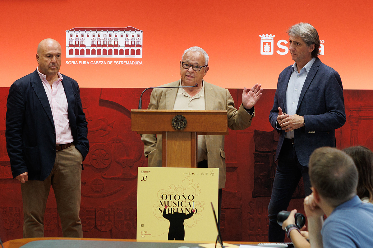 El consejero de Cultura, Turismo y Deporte, Gonzalo Santonja, y el alcalde de Soria, Carlos Martínez, presentaron hoy la programación de este festival que este año conmemora el 150 aniversario del nacimiento del escritor Antonio Machado y el centenario del maestro Odón Alonso, director, compositor y alma impulsora del mismo.