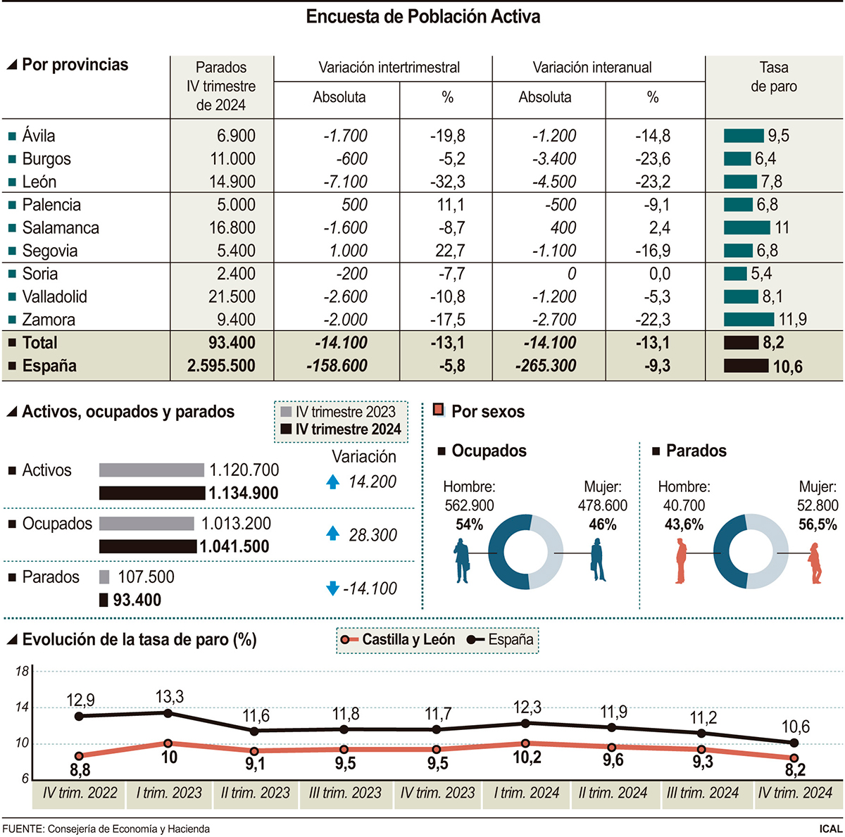 Finalmente, en relación a los ocupados, se redujeron en dos provincias, con un descenso del 3,94 por ciento en Palencia, hasta los 68.300 y del 3,19 por ciento en Soria, hasta los 42.500. Por el contrario, aumentaron un 7,84 por ciento en Valladolid, hasta los 244.700; un 6,71 por ciento en Zamora, hasta los 70.000; un 3,29 por ciento en Ávila, hasta los 66.000; un 2,89 por ciento en Segovia, hasta los 74.700; un 1,91 por ciento en León, hasta los 176.100, y un 0,96 por ciento en Salamanca, hasta los 136.700.
