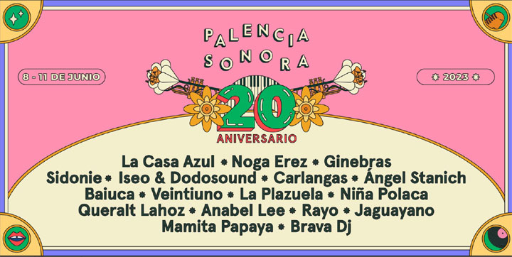 Noga Erez, Ginebras, Carlangas, La Plazuela, Anabel Lee, Rayo y Mamita Papaya se suman a la programación de la vigésima edición de Palencia Sonora, que se celebrará entre el 8 y el 11 de junio del próximo año en el parque del Sotillo de la capital palentina. Estos siete grupos se añaden a los diez que ya había avanzado la organización (La Casa Azul, Sidonie, Iseo & Dodosound, Ángel Stanich, Baiuca, Veintiuno, Niña Polaca, Queralt Lahoz, Jaguayano y Brava DJ) para formar un cartel que celebra las dos décadas de vida de un referente de la música pop-rock independiente en el circuito español de festivales de mediano formato.