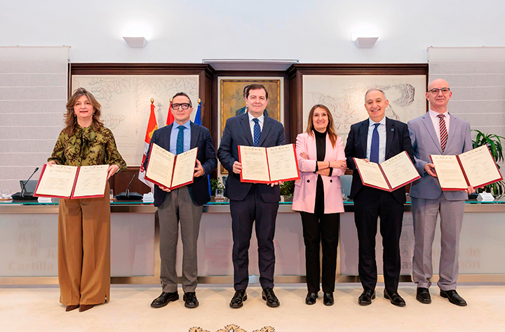Hoy, el presidente de la Junta, Alfonso Fernández Mañueco, firmó en la Sala de Mapas del Colegio de la Asunción de Valladolid un protocolo de colaboración con los rectores de las universidades Burgos, León, Salamanca y Valladolid -José Miguel García, Nuria González, Juan Manuel Corchado y Antonio Largo- para ejecutar entre 2026 y 2031 este plan plurianual y extraordinario, que supondrá un “revulsivo” para la “proyección” y “dinamismo” de estas instituciones académicas.