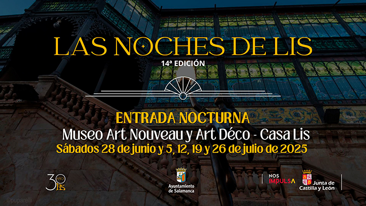 El Museo Art Nouveau y Art Déco Casa Lis de Salamanca recupera una nueva edición de la entrada nocturna para revivir sus “noches mágicas” los sábados comprendidos entre el 28 de junio y el 26 de julio, una iniciativa que cuenta con el apoyo de la Junta de Castilla y León, gracias a la que es posible disfrutar hasta medianoche las 19 colecciones de la exposición permanente, la temporal ‘Danzantes. Mitos y leyendas’ y los conciertos que acogerá La Terraza de Lis.