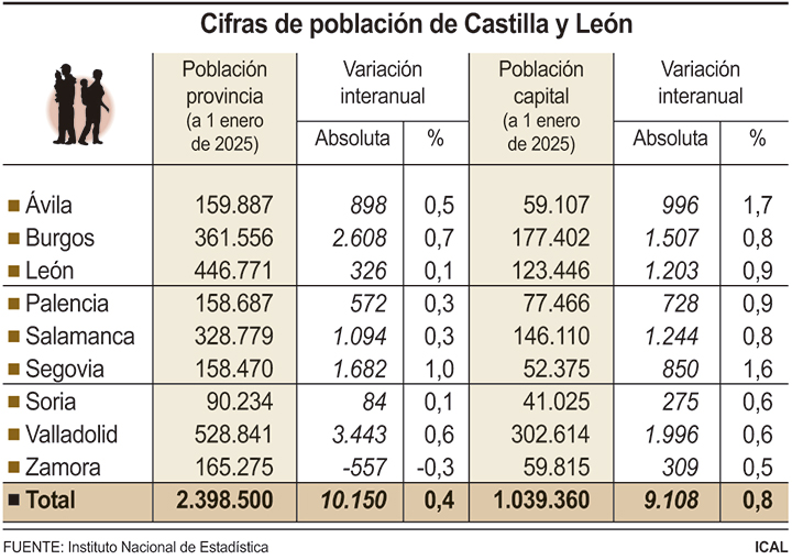 Por lo que respecta a las capitales de provincia, las nueve anotaron crecimientos en sus datos, con una evolución liderada por Ávila, con un 1,71 por ciento más, es decir, 996 personas a mayores que hace un año (59.107 en total), y Segovia, un 1,65 por ciento, con 850 más (52.375).