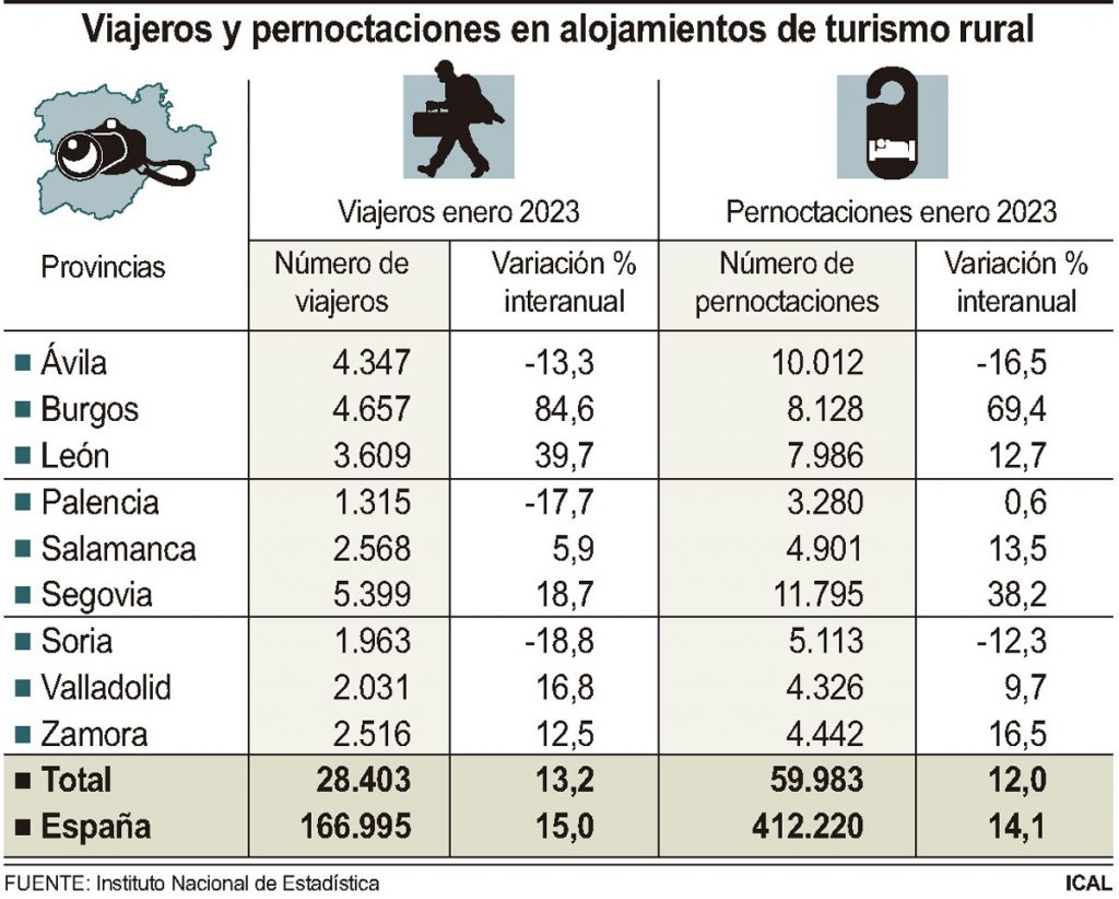 Castilla y León mantuvo su liderazgo en turismo rural durante el mes de enero con 59.983 pernoctaciones, un 11,98% más que en el mismo mes de 2022, mientras en el conjunto del país aumentaron un 14,09 por ciento, hasta las 412.220. Además, los viajeros crecieron un 13,23 por ciento, hasta los 28.405, frente al incremento del 15,02 por ciento de la media nacional, lo que permitió alcanzar los 166.994, según los datos publicados hoy por el Instituto Nacional de Estadística (INE).