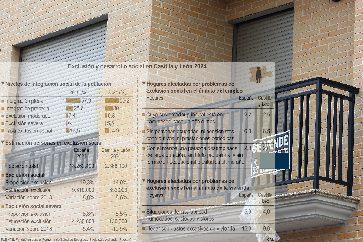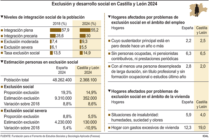 El Informe sobre Inclusión y Desarrollo Social en Castilla y León, elaborado por la Fundación Foessa de Cáritas, recoge que la exclusión social es sinónimo de pobreza, ya que el casi el 84 por ciento de las personas en situación de vulnerabilidad en Castilla y León se encuentra en riesgo de carencia económica. Frente a esa parte de la población, está el 55,2 por ciento de los ciudadanos de la Comunidad que disfruta de una integración plena; el 29,9 por ciento, en situación de integración precaria. Se completa con el 9,3 por ciento de la población que sufre una exclusión moderada.