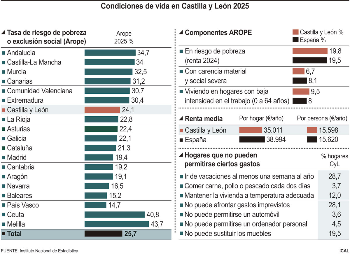 El porcentaje de población de Castilla y León en riesgo de pobreza o exclusión social, medido a través de la tasa Arope (por sus siglas en inglés, At Risk of Poverty or Social Exclusion), se mantuvo en torno al 24 por ciento en 2025, tras aumentar solo una décima con respecto al año anterior, frente al 22,4 por ciento en 2023 y el 22,1 por ciento en 2022. La Encuesta de Condiciones de Vida, publicada hoy por el Instituto Nacional de Estadística y recogida por Ical, también destaca que el ocho por ciento de los castellanos y leoneses tuvo “muchas dificultades» para llegar a final de mes, que es medio punto más que en 2024 y supone el mayor porcentaje desde 2020, cuando se alcanzó el 8,4 por ciento.