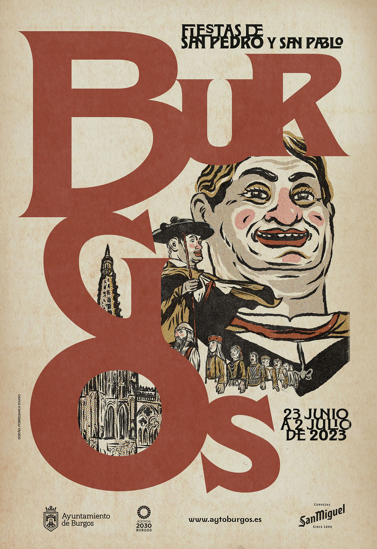 La propuesta del estudio PobrelaVaca fue la elegida para el cartel de Burgos para las Fiestas Mayores de San Pedro y San Pablo 2023. La concejala de Festejos del Ayuntamiento de Burgos, Blanca Carpintero, presentó hoy la imagen de las fiestas de San Pedro y San Pablo 2023, acompañada por Ana María Hernández Babón, del estudio de diseño PobrelaVaca.