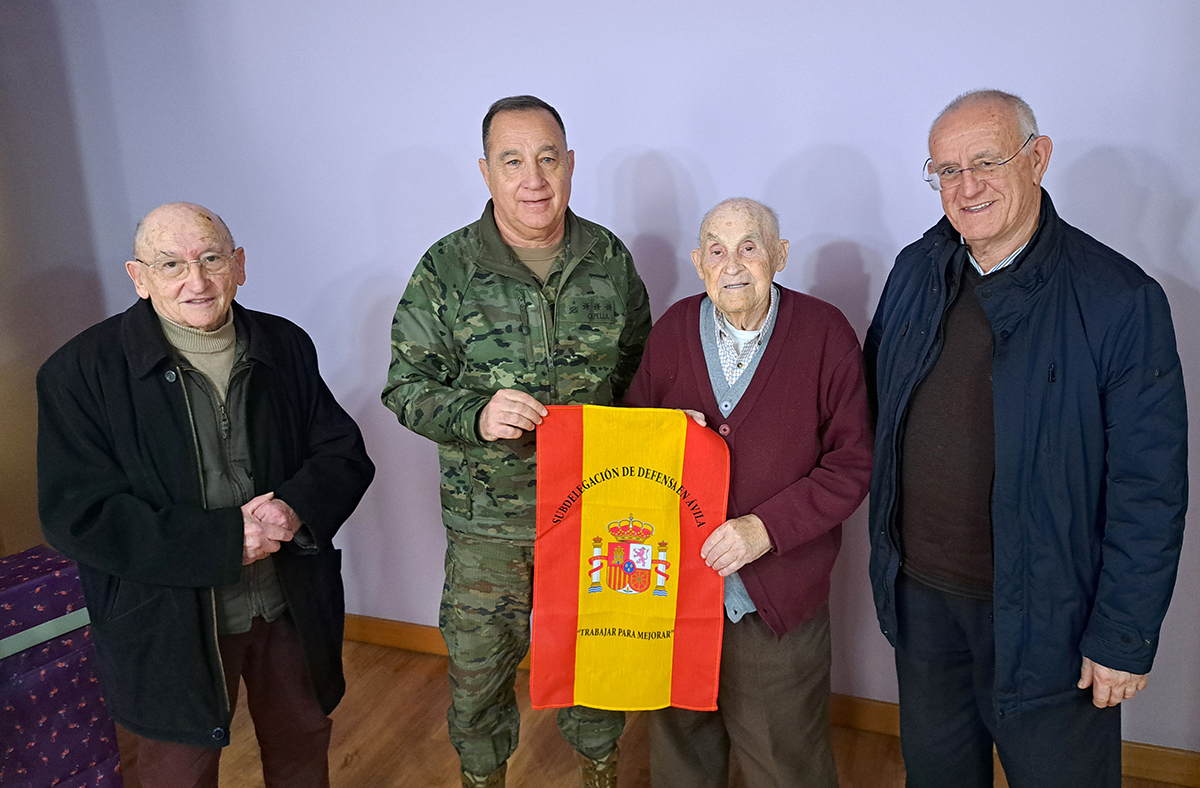 El subdelegado de Defensa en Ávila, acompañado por representantes de la Hermandad de Veteranos de las FFAA y de la Guardia Civil, visitaron a uno de los militares de mayor edad en la provincia de Ávila, comandante de Oficinas Militares del Ejército de Tierra Eloy Martínez Valero en su domicilio particular, esta mañana del 5 de enero de 2026, próximos a la Pascua Militar y a la llegada de los Reyes Magos de Oriente. Durante la visita se le entregaron varios regalos, y entre ellos la Bandera de Mochila o Percha de la Subdelegación de Defensa en Ávila.