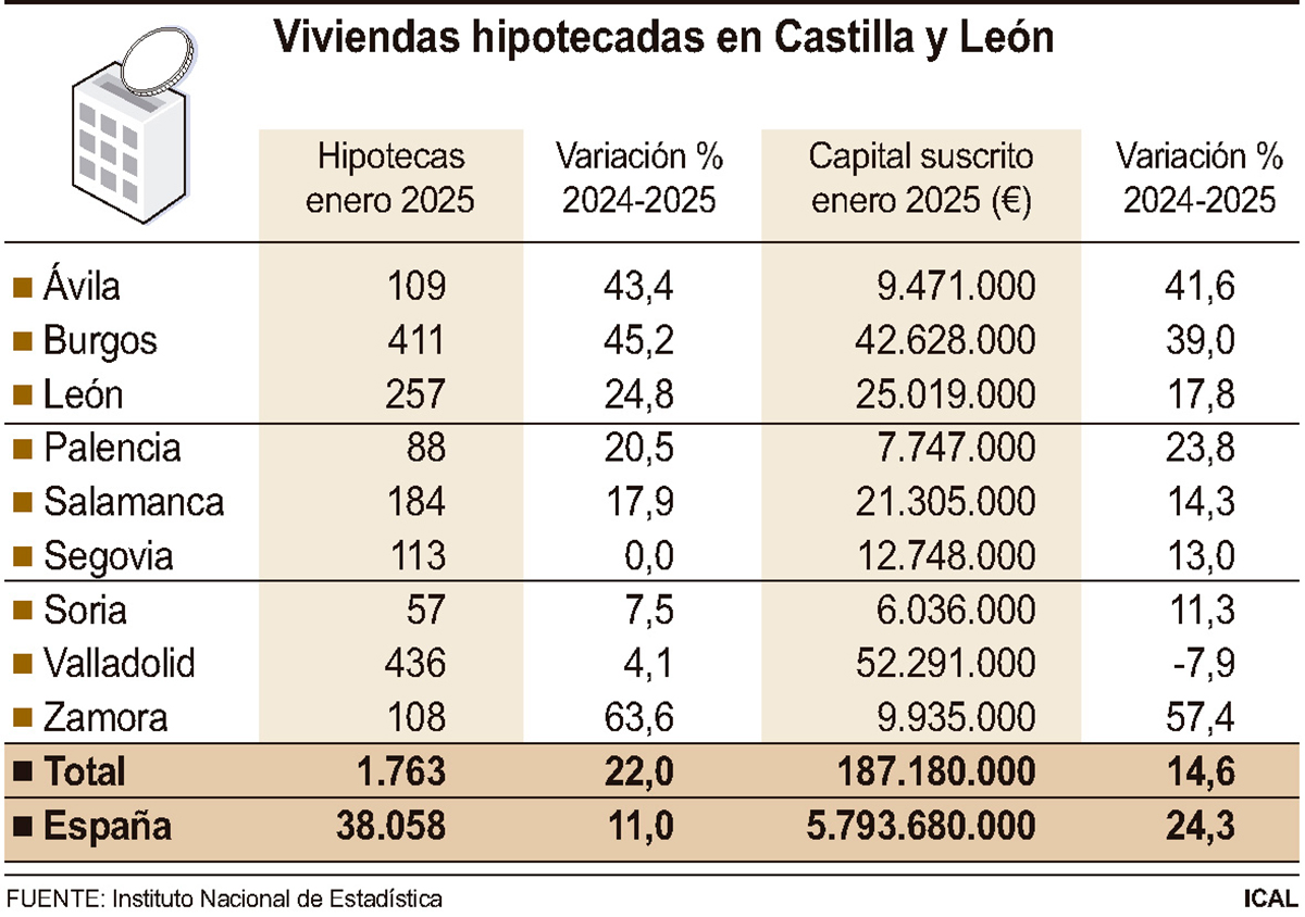 El número de hipotecas constituidas sobre viviendas en Castilla y León experimentó en enero una subida del 22 por ciento interanual, la décima más alta del país en términos porcentuales, hasta las 1.763, lo que se traduce en el doble que la evolución nacional, donde se elevó un 11 por ciento, hasta las 38.058, según reflejan los datos publicados hoy por el Instituto Nacional de Estadística (INE) y recogidos por la Agencia Ical.