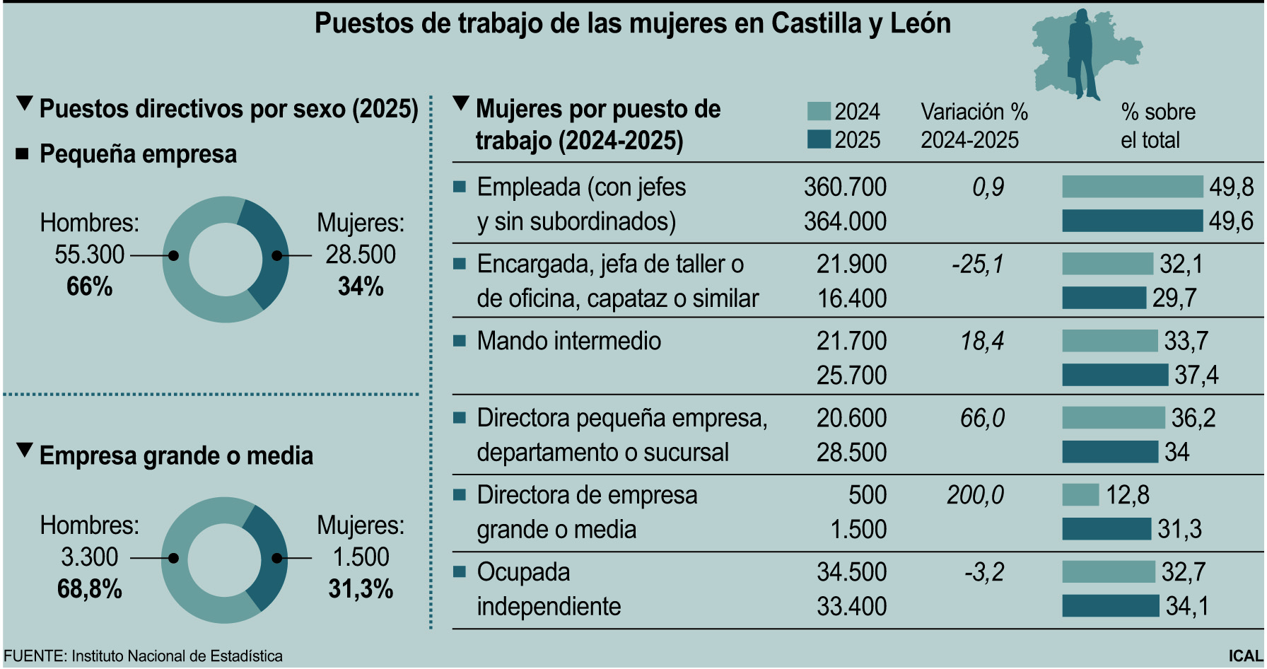 Las mujeres ganaron peso en puestos de director de grandes o medianas empresas durante 2025 en Castilla y León y representaron el 31,3 por ciento de los ocupados en esas responsabilidades, cuando el año anterior apenas suponían el 12,8 por ciento, 18,5 puntos porcentuales más. En concreto y según los datos de la submuestra de la Encuesta de Población Activa (EPA) publicada por el Instituto Nacional de Estadística (INE), con la media de los cuatro trimestres del año pasado, había en la Comunidad, unas 1.500 directoras en grandes y medianas compañías, frente a las 500 contabilizadas en 2024. En total, la EPA indica que en puestos de director de grandes y medianas empresas estaban ocupadas 4.800 personas el año pasado, frente a las 3.900 de 2024, de las que 3.300 eran hombres, que mermaron un 2,9 por ciento, como recoge Ical.