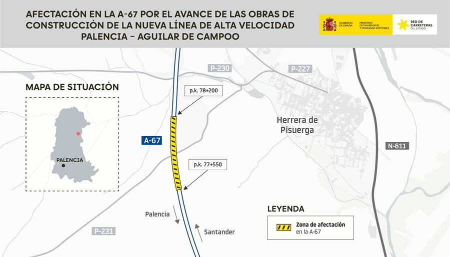 Las obras de construcción de la línea de Alta Velocidad entre Palencia y Aguilar de Campoo obligarán a realizar cortes parciales en la A-67 a su paso por Herrera de Pisuerga durante un periodo estimado de cinco meses, a partir del próximo 19 de febrero.