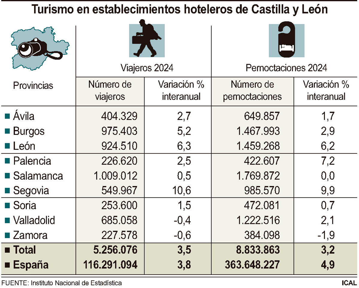 Según el INE, en Castilla y León el número de establecimientos hoteleros abiertos al cierre del pasado año era de 996, con 26.286 habitaciones y 50.669 plazas ofertadas. El grado de ocupación por plaza fue del 36,4 por ciento, frente a la media nacional del 49,03 por ciento. En el caso de los fines de semana este porcentaje subió hasta el 49,4 por ciento, mientras que en el conjunto de España fue del 57,57 por ciento.