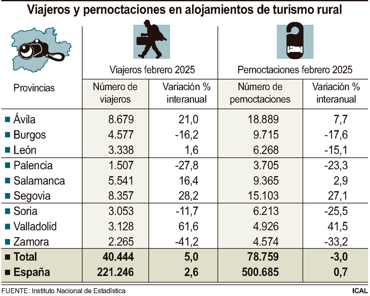 Las pernoctaciones de turismo rural en Castilla y León cayeron el pasado febrero un tres por ciento, al pasar de las 81.200 del pasado año, a las 78.759 del segundo mes de 2025. Por el contrario, según los datos publicados hoy por el Instituto Nacional de Estadística, los viajeros se incrementaron un cinco por ciento, y alcanzaron los 40.445, por encima del aumento a nivel nacional, que fue del 2,6 por ciento, hasta los 221.247 turistas.