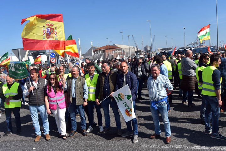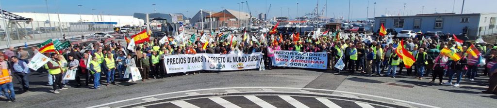 Agricultores de Castilla y León trasladaron hoy sus manifestaciones al Puerto de Santander, en una protesta organizada en unidad de acción por Asaja, COAG y UPA, para denunciar la “situación crítica que vive el sector y especialmente los precios ruinosos que se están pagando por el cereal, cuya cotización se ha hundido por causa de las masivas importaciones de grano procedente de terceros países, como Rusia y especialmente de Ucrania”.