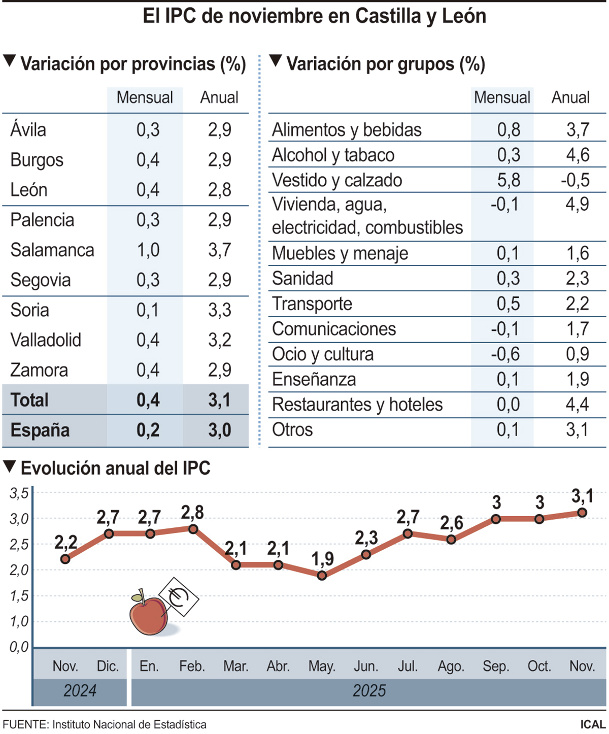 Por provincias, los precios aumentaron en todas con respecto a noviembre de 2024. Los mayores crecimientos se produjeron en Salamanca (3,7 por ciento), Soria (3,3) y Valladolid (3,3), por encima de la barrera del tres por ciento. Por debajo, con el 2,9 por ciento más se encuentran Ávila, Burgos, Palencia, Segovia y Zamora. Y cierra León, con el 2,8 por ciento.