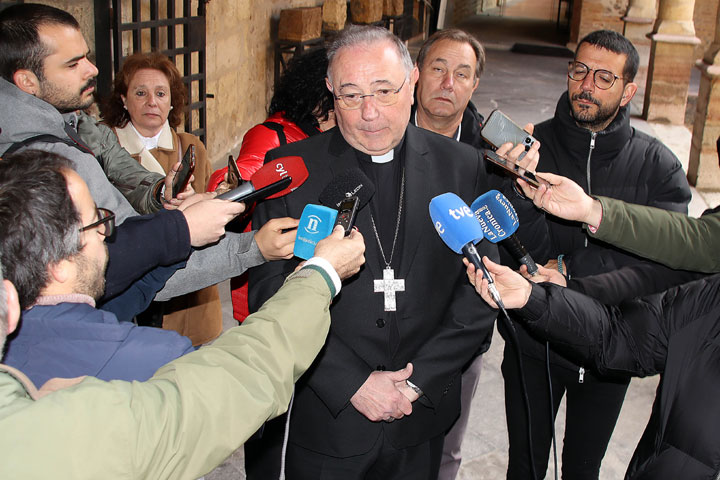 Los 14 internos del Centro Penitenciario de León en Mansilla de las Mulas y del Centro de Inserción Social-CIS Jesús Haddad que en la tarde de este martes participan como braceros en la Procesión del Perdón de la capital se mostraron hoy felices y expectantes durante su encuentro previo con el obispo de León, Luis Ángel de las Heras.