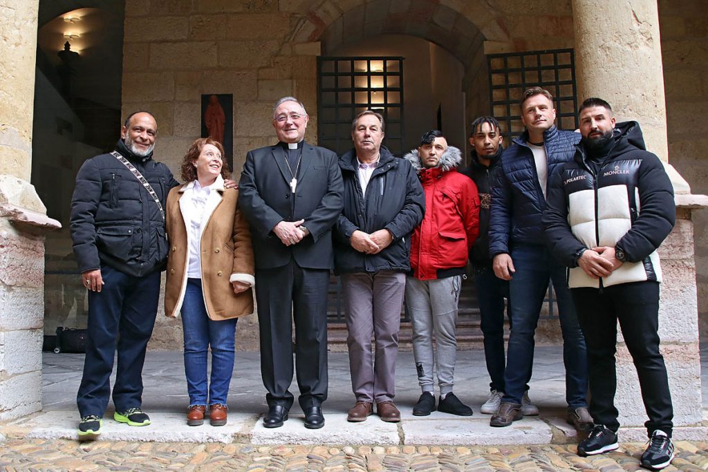 Los 14 internos del Centro Penitenciario de León en Mansilla de las Mulas y del Centro de Inserción Social-CIS Jesús Haddad que en la tarde de este martes participan como braceros en la Procesión del Perdón de la capital se mostraron hoy felices y expectantes durante su encuentro previo con el obispo de León, Luis Ángel de las Heras.