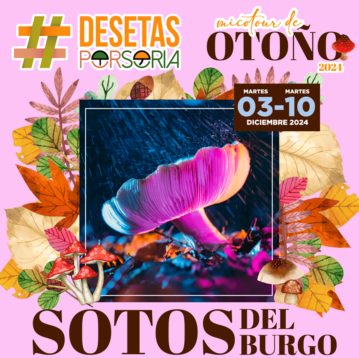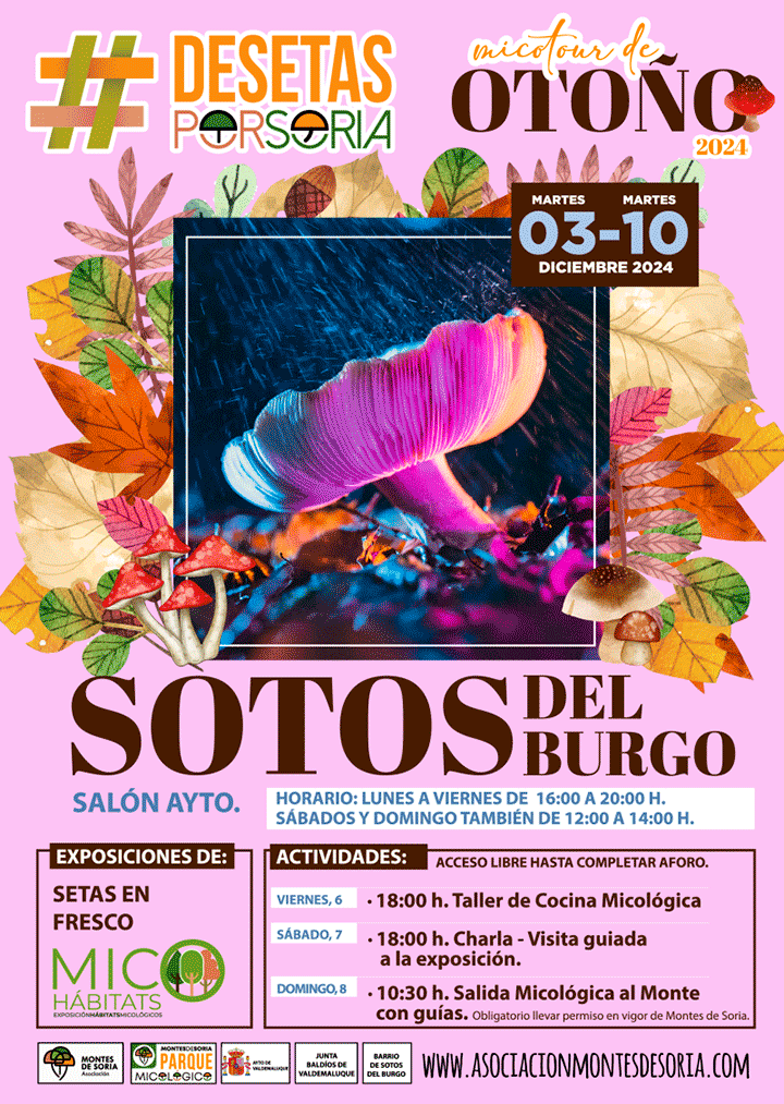 El Micotour de otoño estará también presente en Sotos del Burgo donde podrá contemplarse en el salón del Ayuntamiento hasta el martes día 10 de diciembre en horario de 16 a 20 horas y el sábado y domingo se amplía el horario por la mañana de 12 a 14 horas. Para Sotos del Burgo están previstas dos exposiciones, la nueva muestra MICOhabitats, que se estrenó este otoño, y la exposición de Setas en fresco. Además, durante el puente se realizarán varias actividades micológicas con acceso libre hasta completar aforo. Comenzarán el viernes día 6 con el taller de cocina micológica a las 18 horas.
