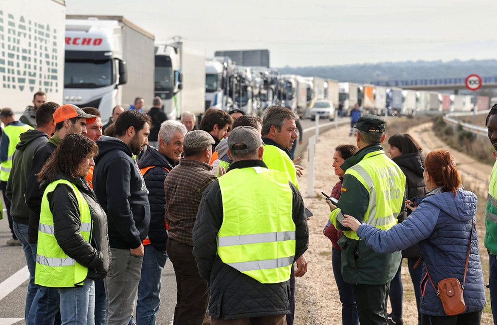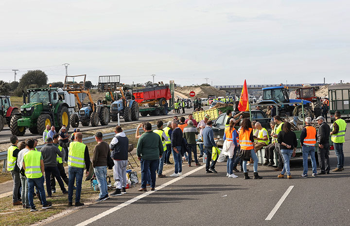 Vicente / ICAL. Agricultores y ganaderos españoles cortan la autovía A-62 en Fuentes de Oñoro (Salamanca)
